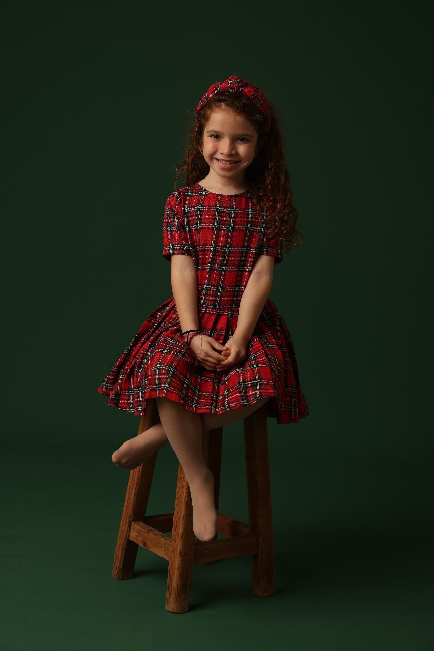 Get ready for the holidays in this vibrant, classic dress! Featuring a bold red tartan plaid print, this dress includes simple short sleeves and a tailored bodice that flows into a wonderfully voluminous, pleated skirt.