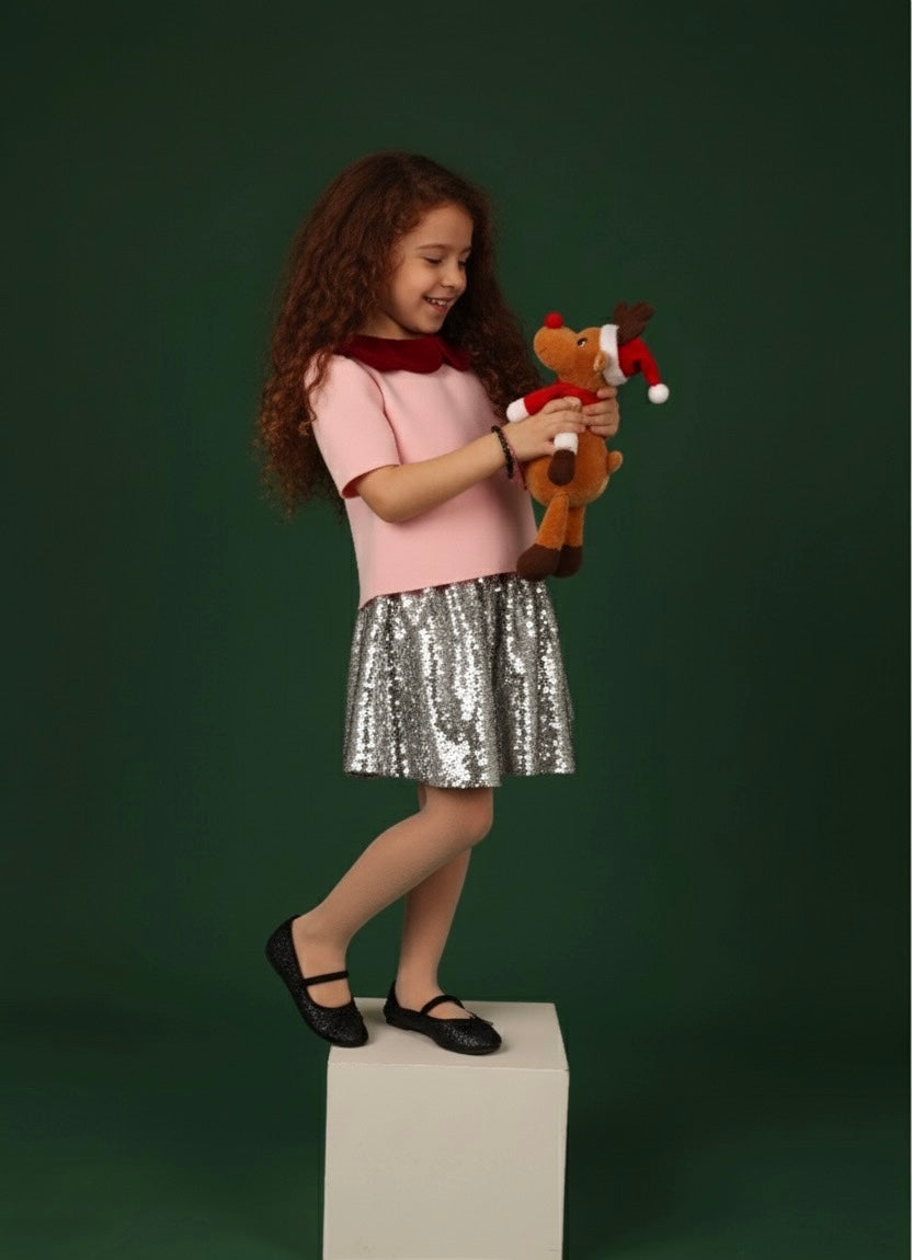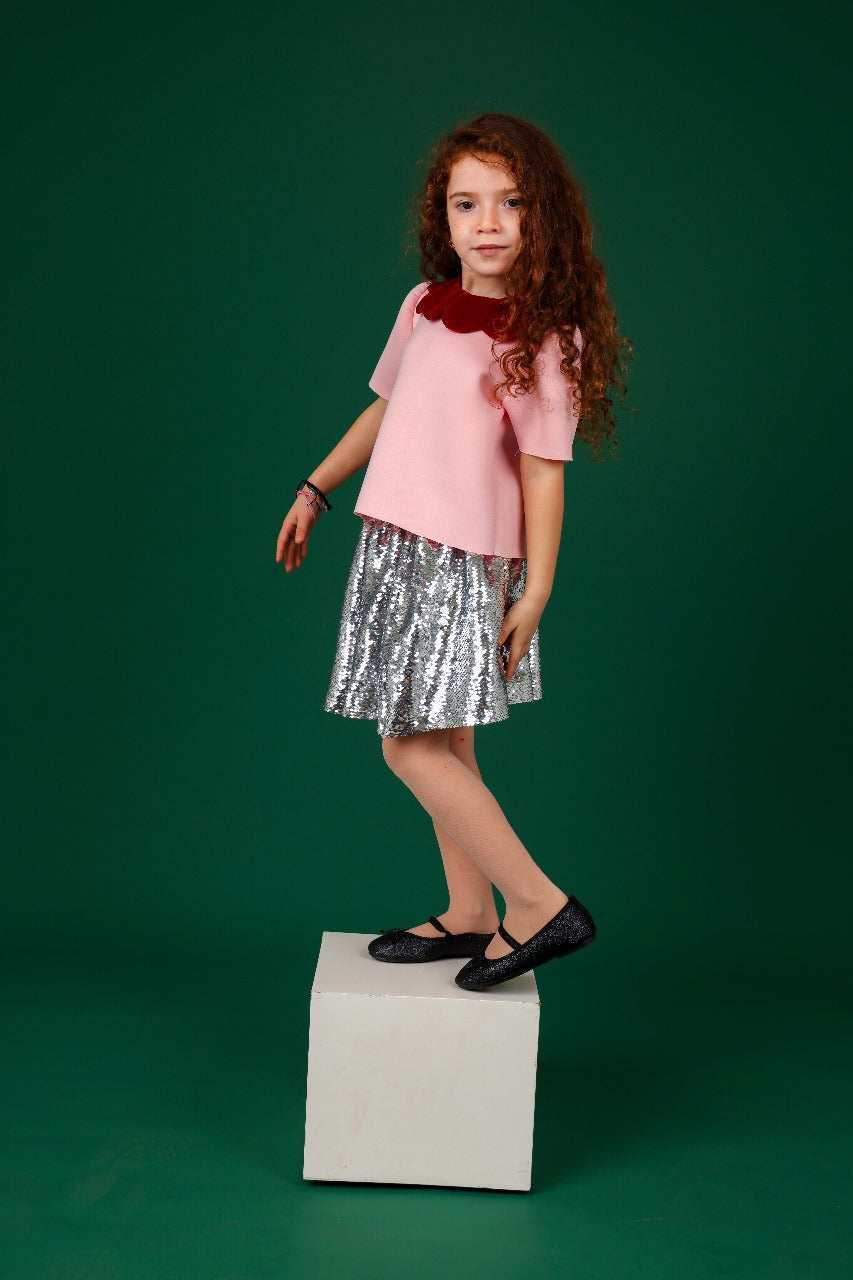 Get ready to dazzle! This celebratory two-piece set features a classic light pink top with a stylishly contrasting burgundy velvet Peter Pan collar. The top is perfectly paired with a shimmering mini-skirt completely covered in brilliant silver sequins. It’s the ideal outfit for making a statement at any party or special event.